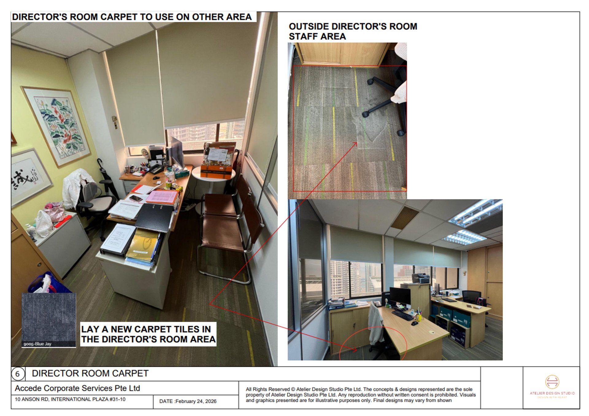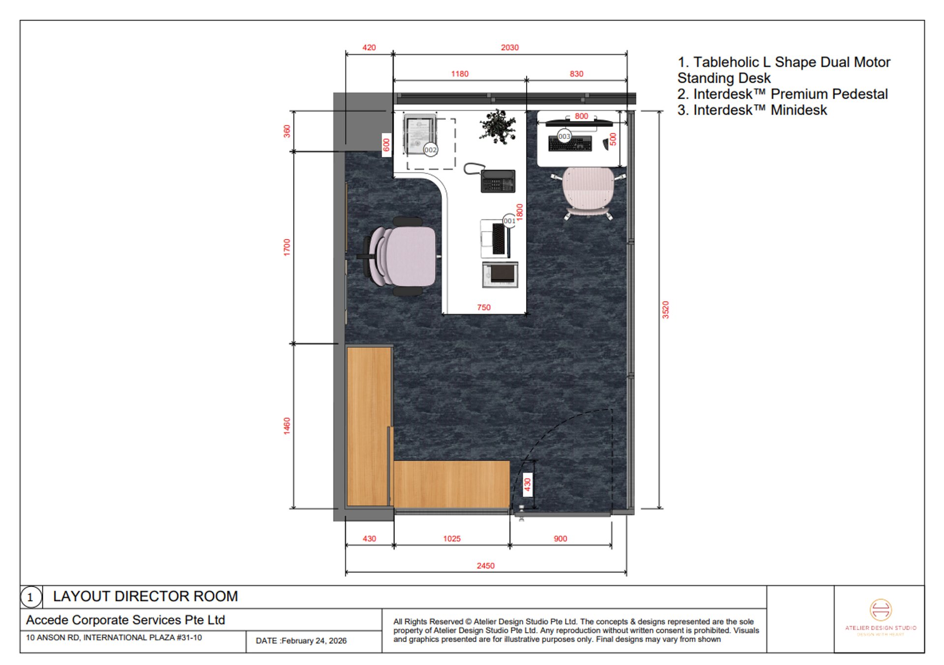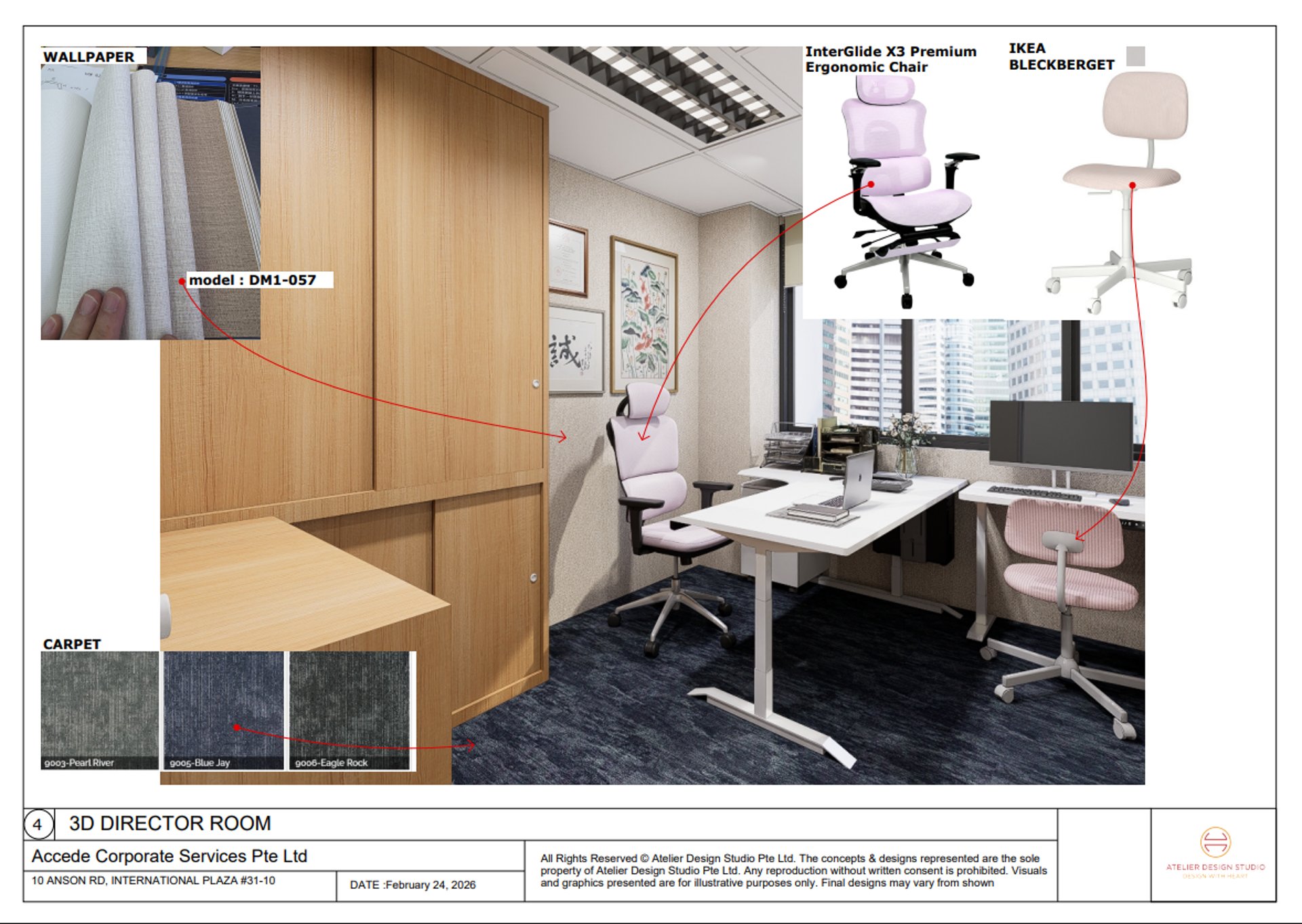 This director’s room at Accede Corporate Services is designed with a clean, contemporary approach that prioritizes clarity, efficiency, and professional presence. The layout is intentionally straightforward, allowing for smooth movement while clearly defining zones for focused work, discussion, and storage within a compact footprint.