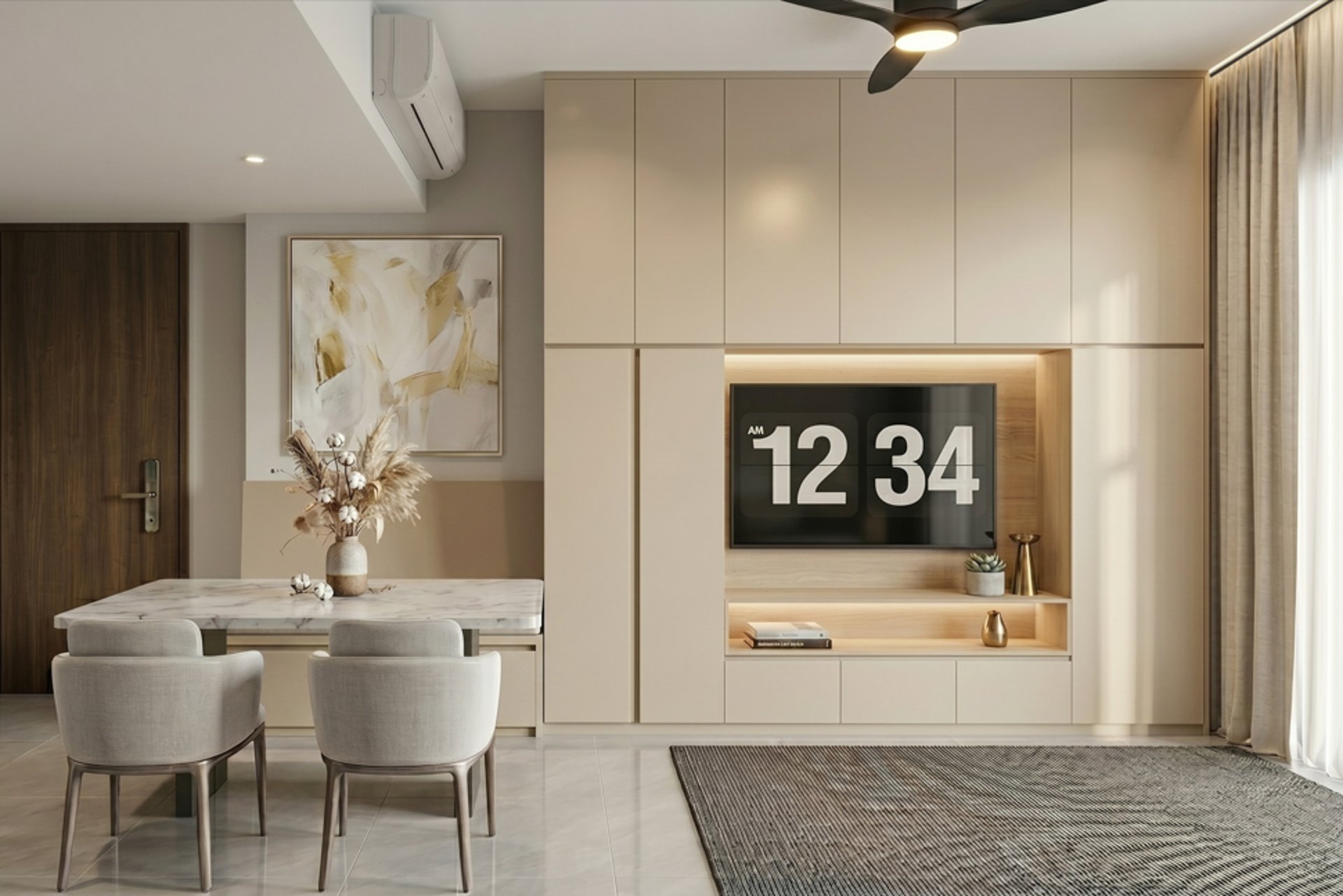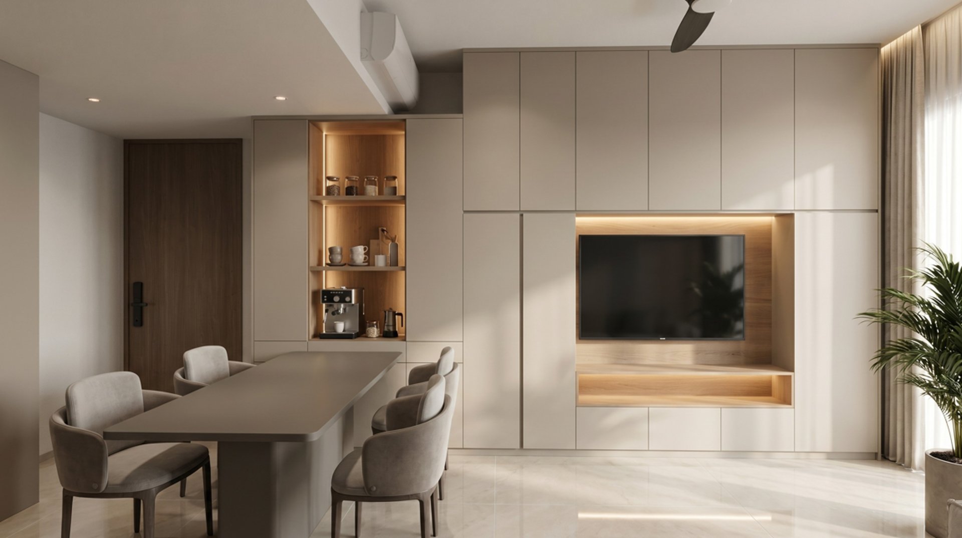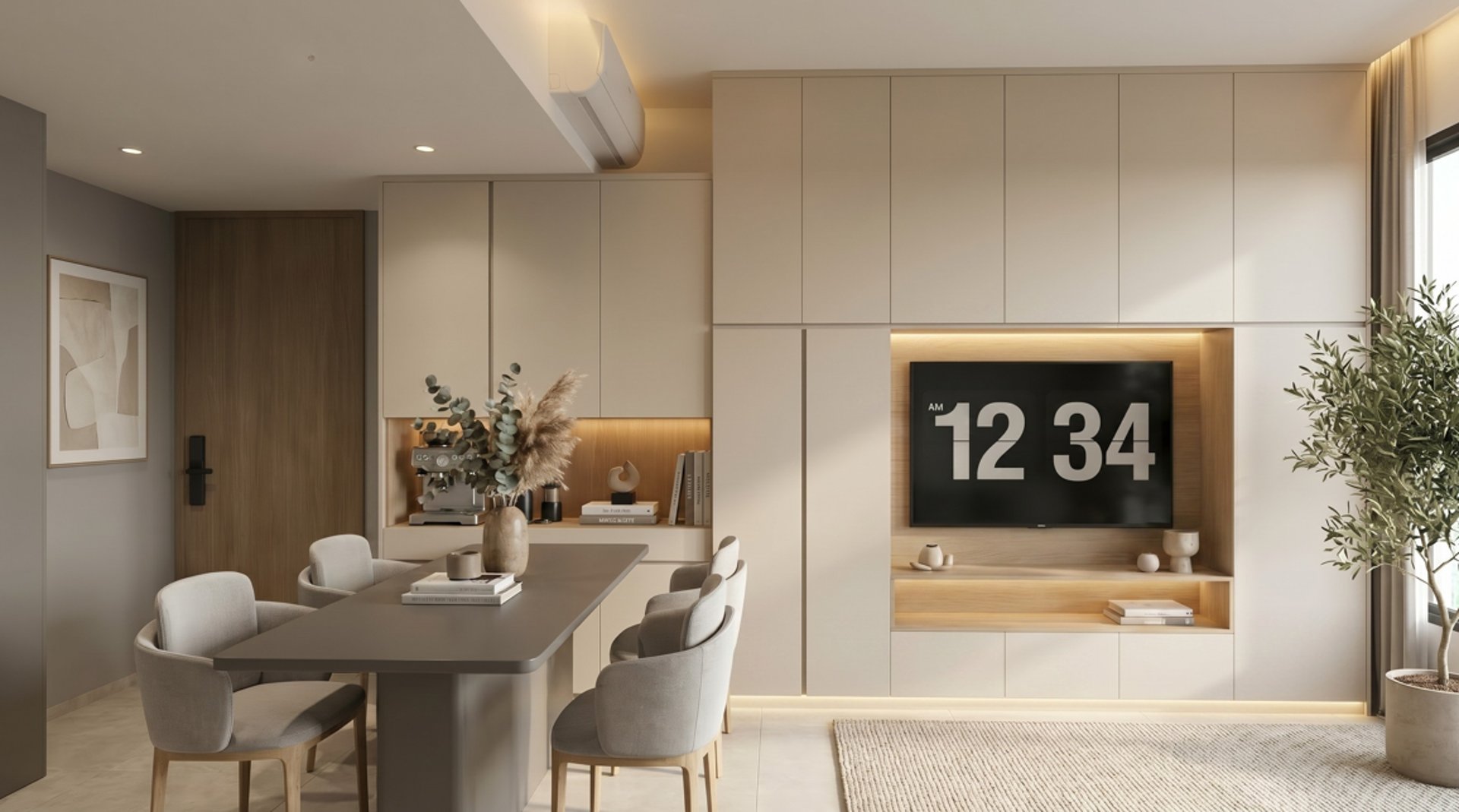 This three-bedroom unit at Alutra is designed with a contemporary minimalist approach, focusing on clean carpentry integration and practical day-to-day living. The layout is kept efficient and intuitive, ensuring smooth circulation between the living, dining, and private zones while maintaining a clear separation of functions.