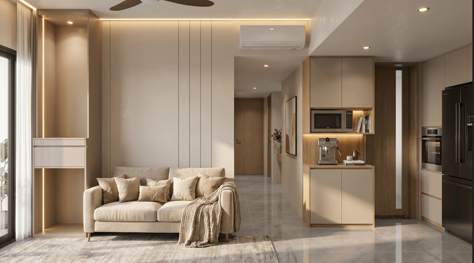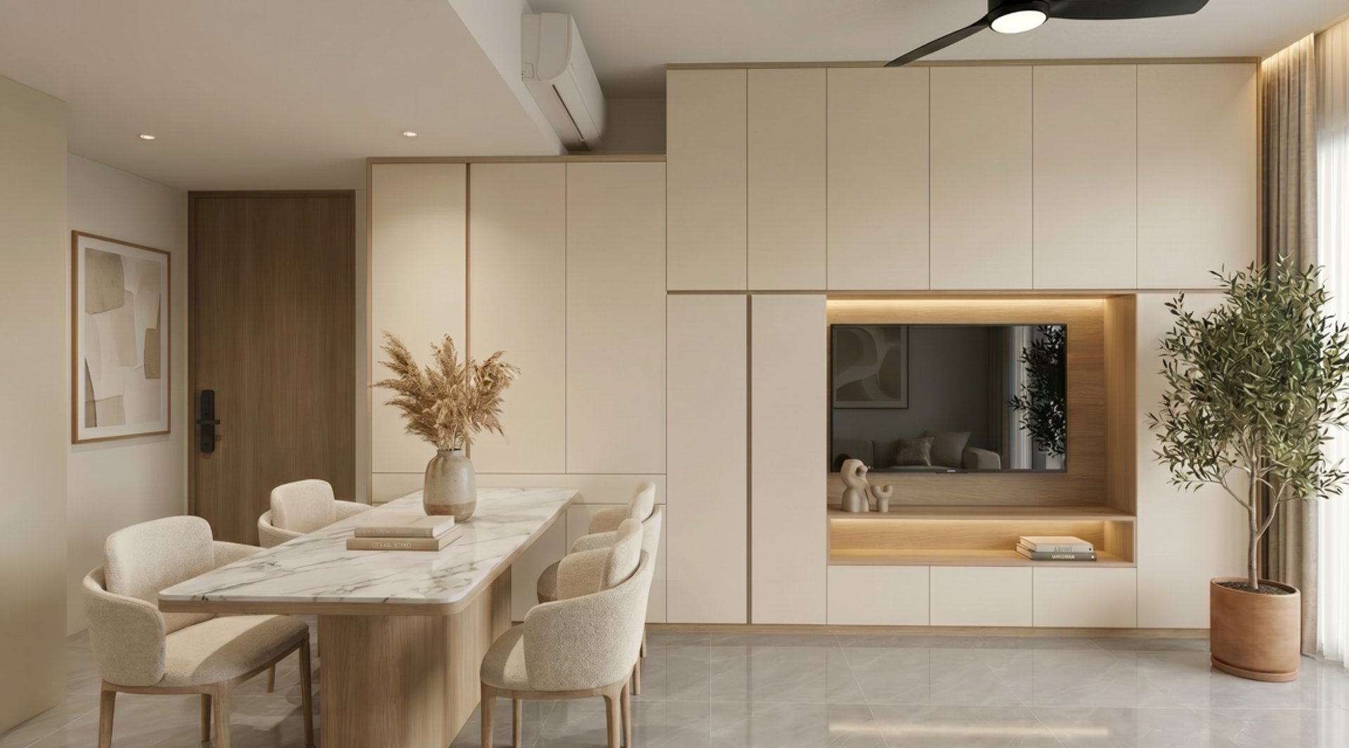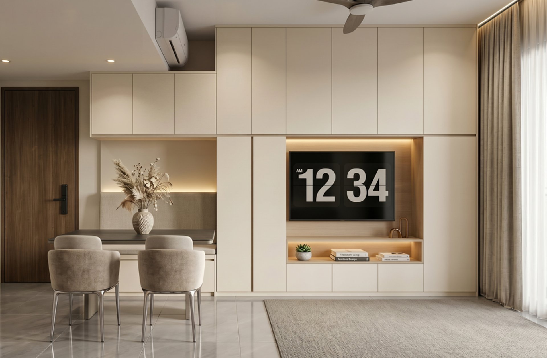 This three-bedroom unit at Alutra is designed with a contemporary minimalist approach, focusing on clean carpentry integration and practical day-to-day living. The layout is kept efficient and intuitive, ensuring smooth circulation between the living, dining, and private zones while maintaining a clear separation of functions.