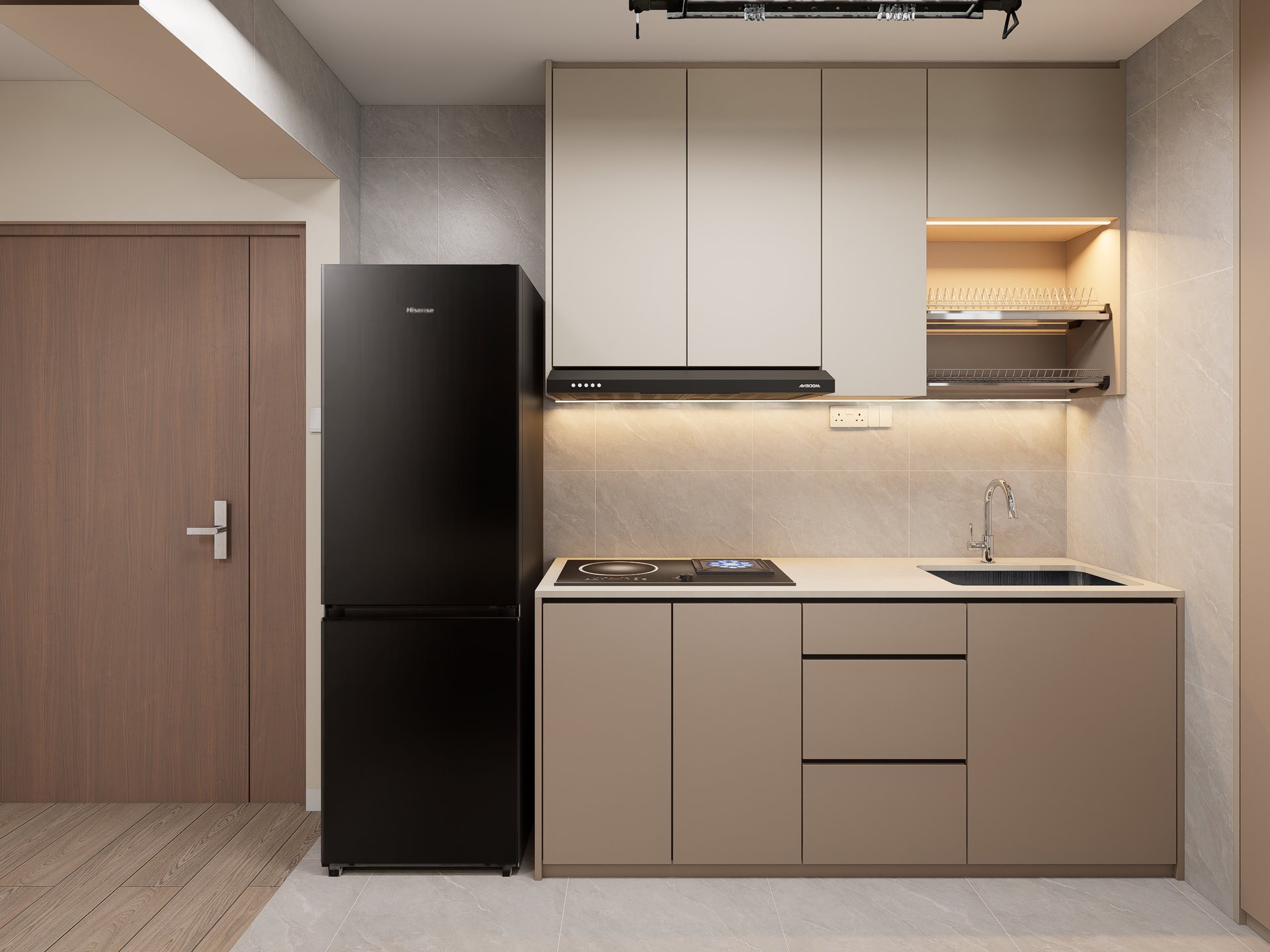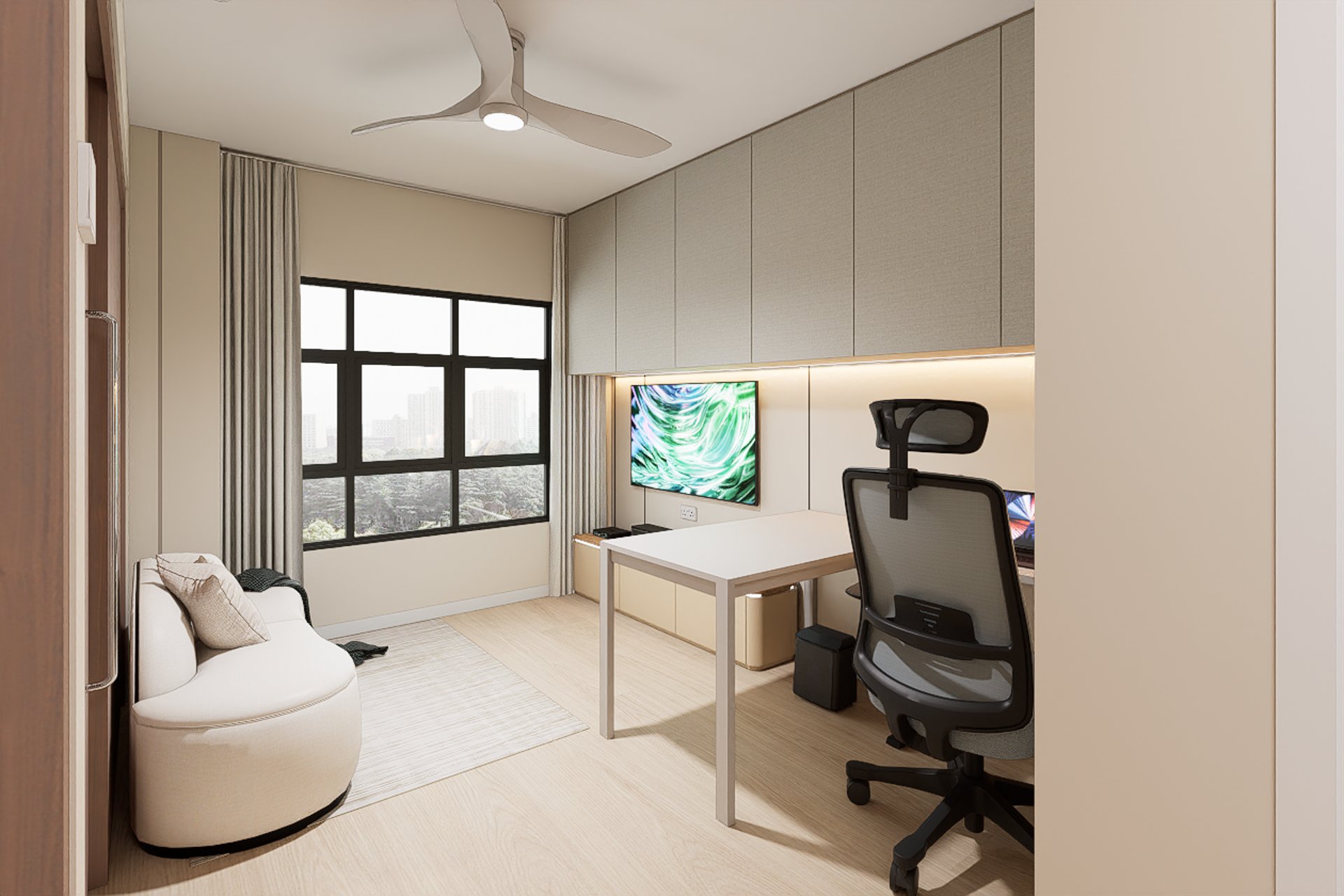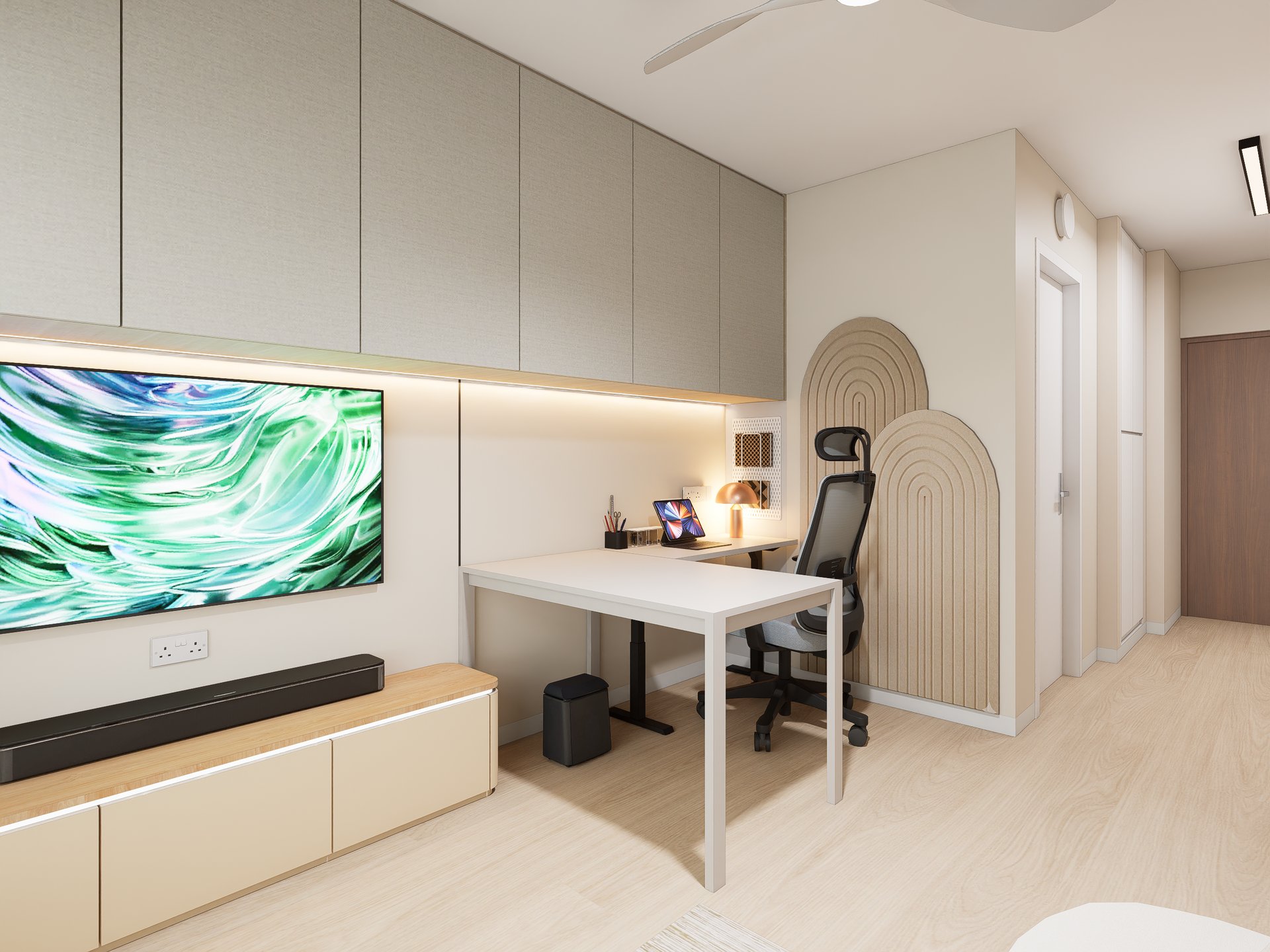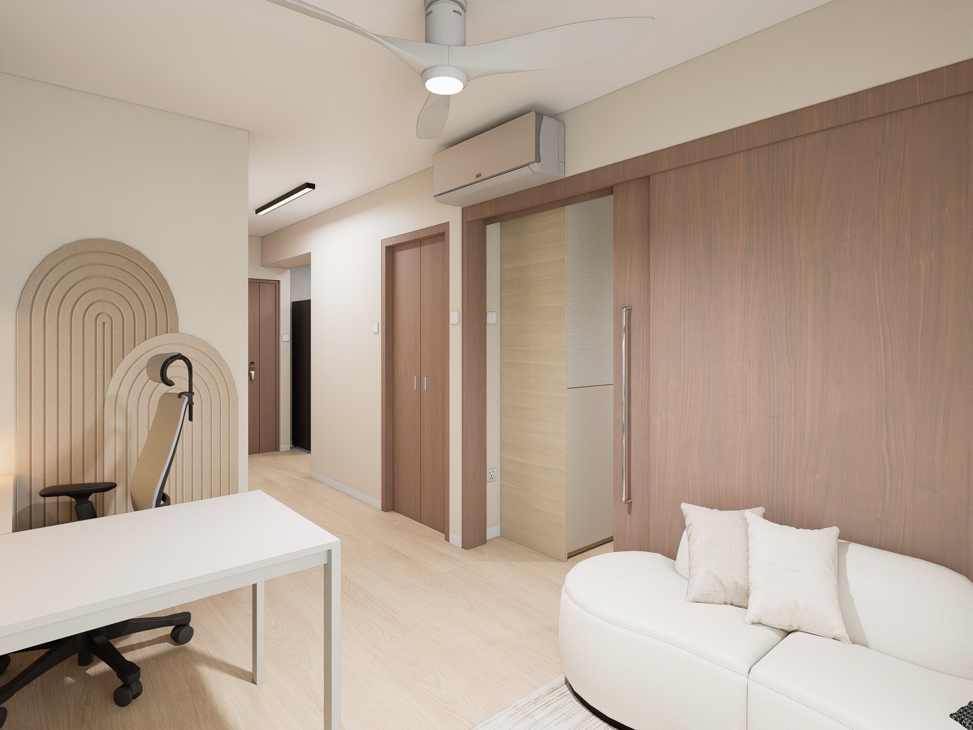 This 2-room flexi unit is designed as a compact, highly efficient home that balances everyday functionality with a clean, modern aesthetic. The layout is streamlined to maximize usable space, with the living, dining, and workspace zones integrated into a single open area that feels both practical and comfortable despite the limited footprint.