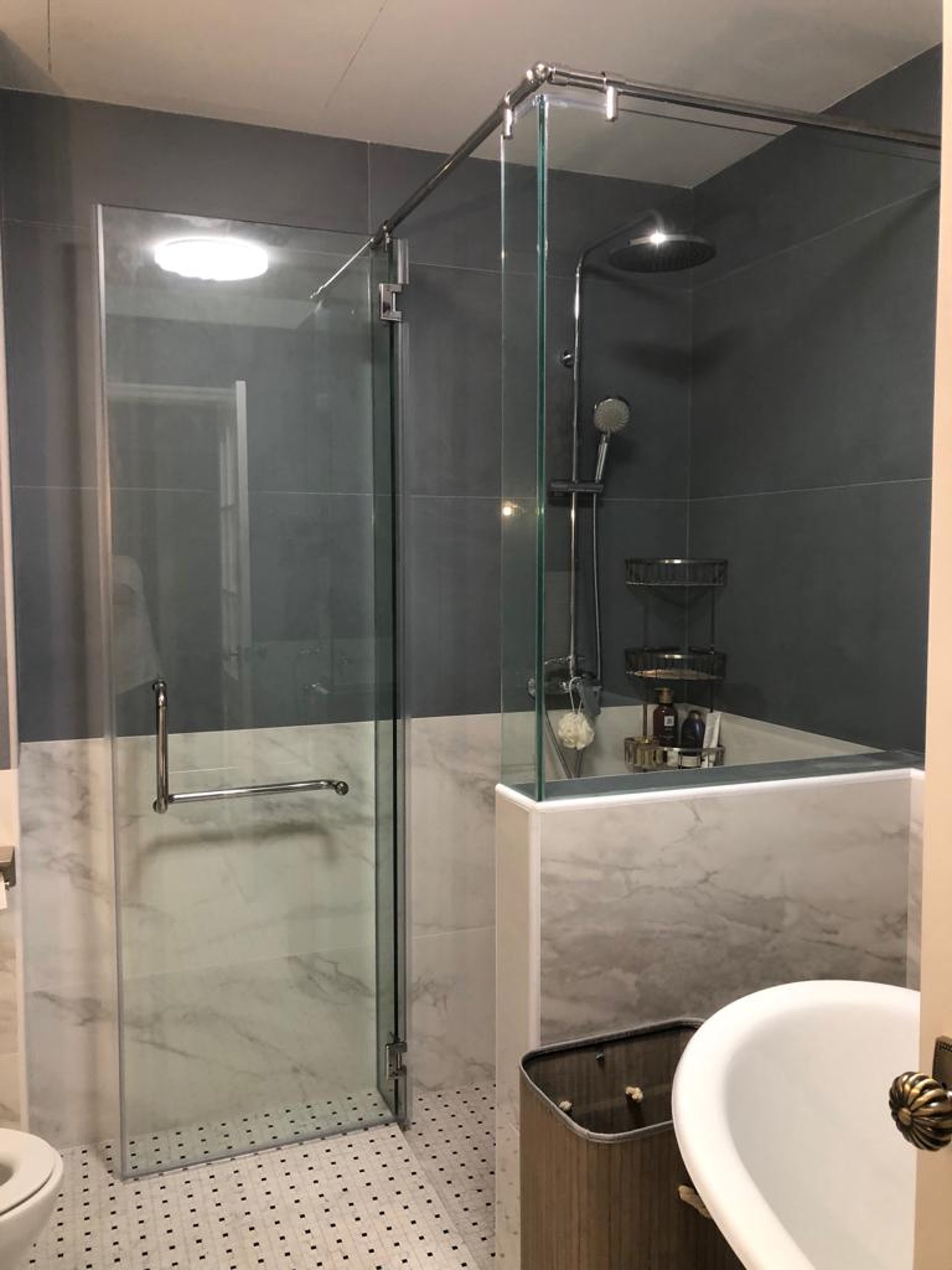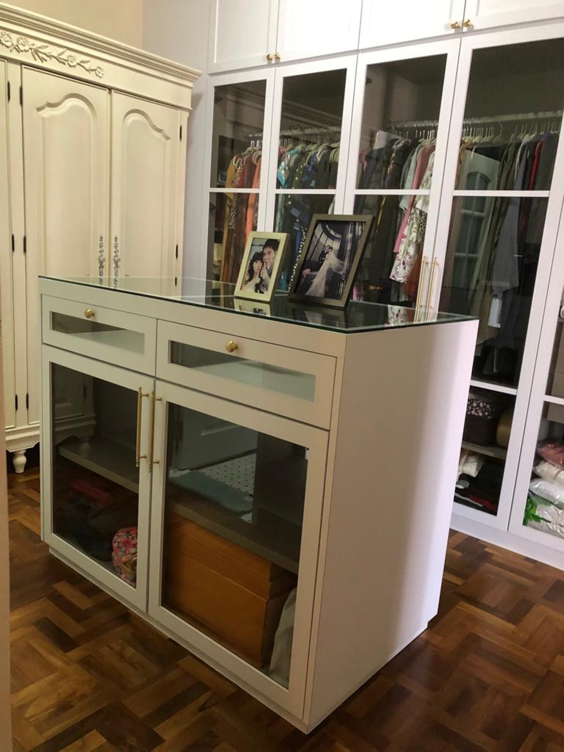 The custom glass display island serves as both a centerpiece and a practical storage solution — ideal for jewelry, accessories, or keepsakes. Surrounding it, the full-height wardrobe with glass-paneled doors provides a perfect balance of display and discretion, allowing clothing to become part of the visual harmony.